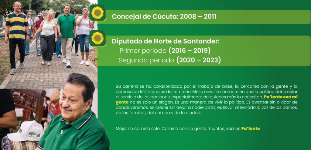 Mejía es un hijo auténtico de Cúcuta. Creció en barrios populares, donde aprendió desde niño el valor de la solidaridad, el respeto y el trabajo comunitario. Su vocación social nace en casa: heredó de su padre el compromiso con las comunidades y el servicio a las familias más necesitadas.